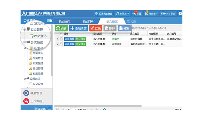 通过流程审批实现公文承办后,并进行收文归档、添加收文、分发