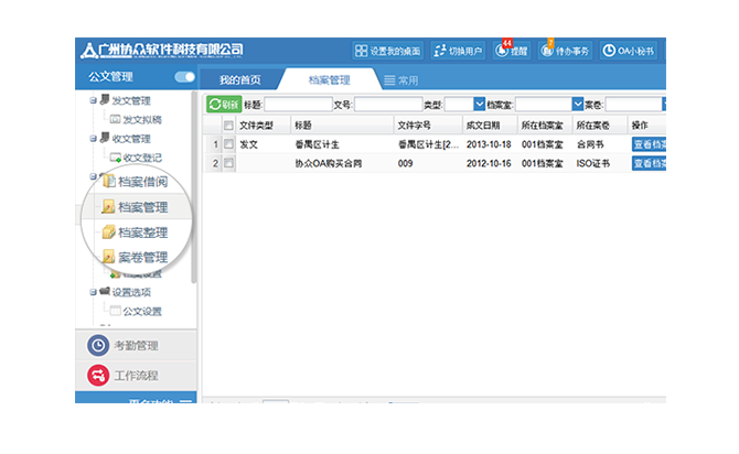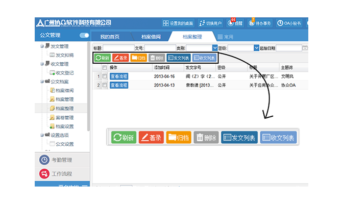 该功能完全模拟当前政府部门的档案处理方式来进行档案的管理和使用。对收发文或者著录的档案进行查看或查询